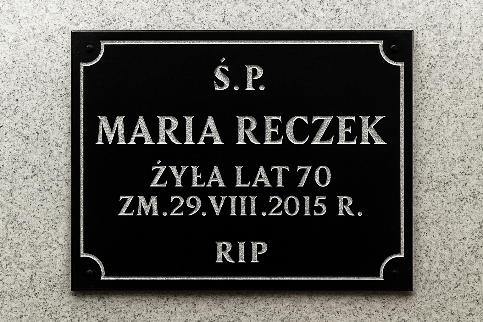 Gotową tablicę wysyłam kurierem lub Pocztą Polską, starannie zabezpieczoną przed uszkodzeniem. Oferuję różne systemy montażu: taśmy montażowe, dystanse, śruby — zależnie od rodzaju pomnika lub urny.
